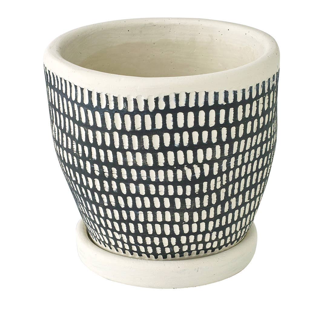 One of the hottest and latest trends is cement. We have taken this material and interpreted it into hip planters. Each piece done in a naïve or primitive geometric pattern has a wonderful textural feel to its outside surface. They are purposely designed to have this look. They are hand-finished, so no two will be alike. Ideal for retail, plant and flower shops. Each piece includes a pot and saucer. Planters designed with holes in the bottom for easy water drainage. So, plant directly into each piece, add water and lots of love. Great for growing your favorite herbs too! Perfect for indoor or outdoor use.